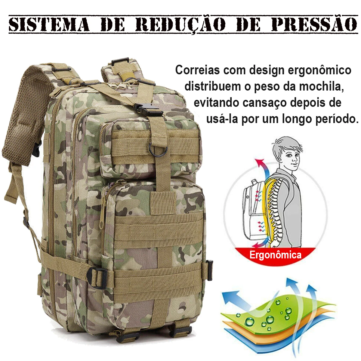 Mochila Tática Multiuso ideal para Camping, Trilhas e também para carregar o material escolar e notebooks até 13 polegadas.